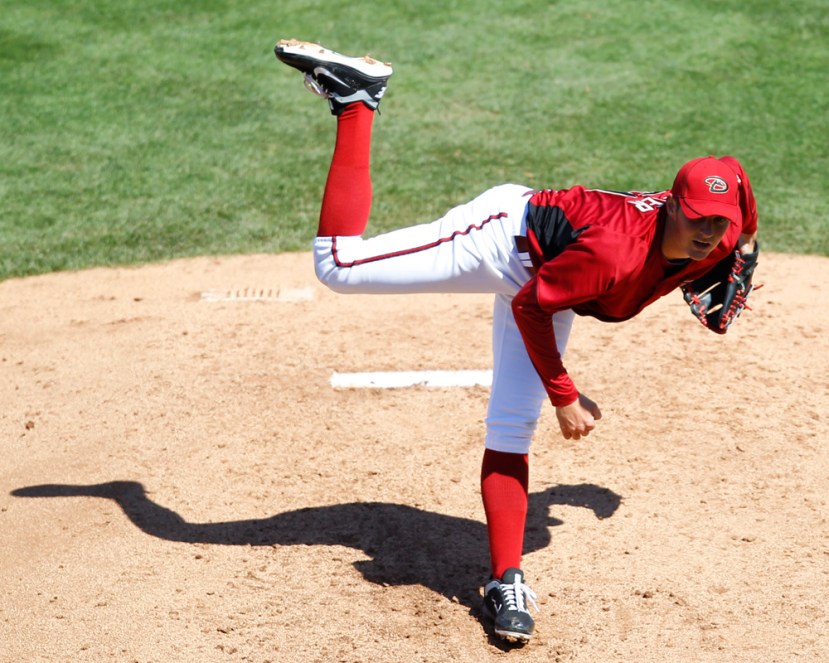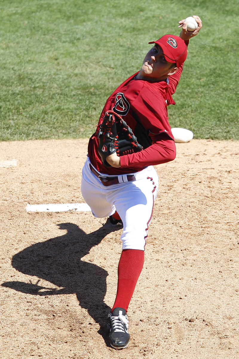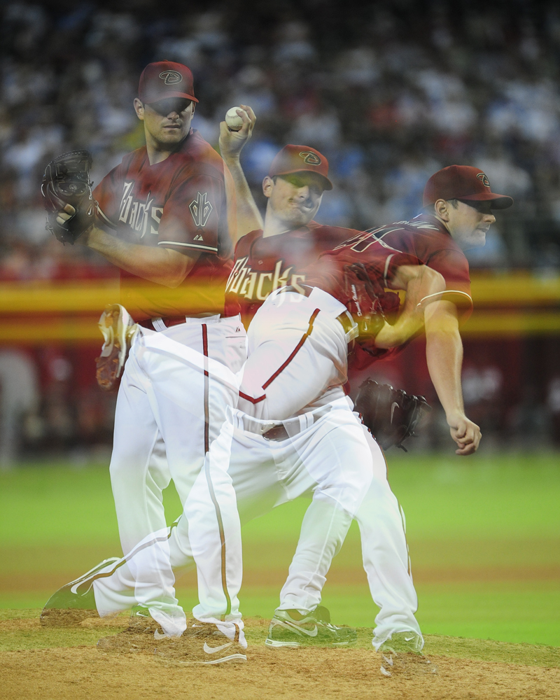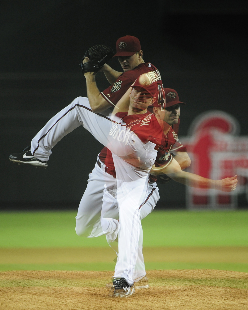 The photo wells at Chase Field are on the inside of either dugout, near the on-deck circles. Those wells are where we shoot from most of the time. But, sometimes we roam out into different locations. This past homestand, the dugout suite on the third base side was empty, so we were able to capture some images from an angle that we don’t see very often (as you can see in the photos of the pitchers above and the ones below).